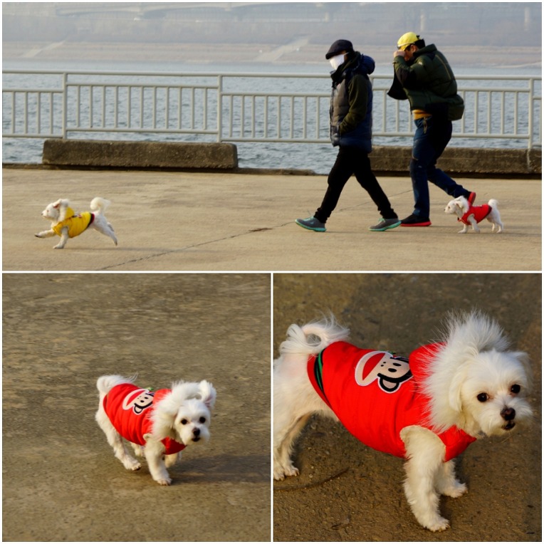부부가 강바람에 거닐 때 노랑, 빨강 커플로 나들이 온 강아지도 한 컷