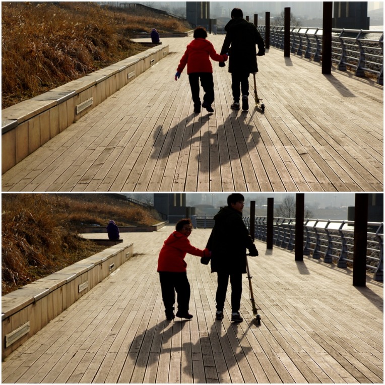 몸이 불편하신 할머니 손을 잡고 나온 착한 학생 뒷모습의 그림자가 긴 여운을 남겼습니다.