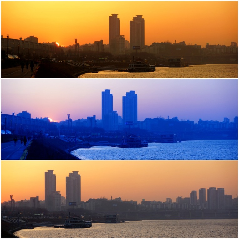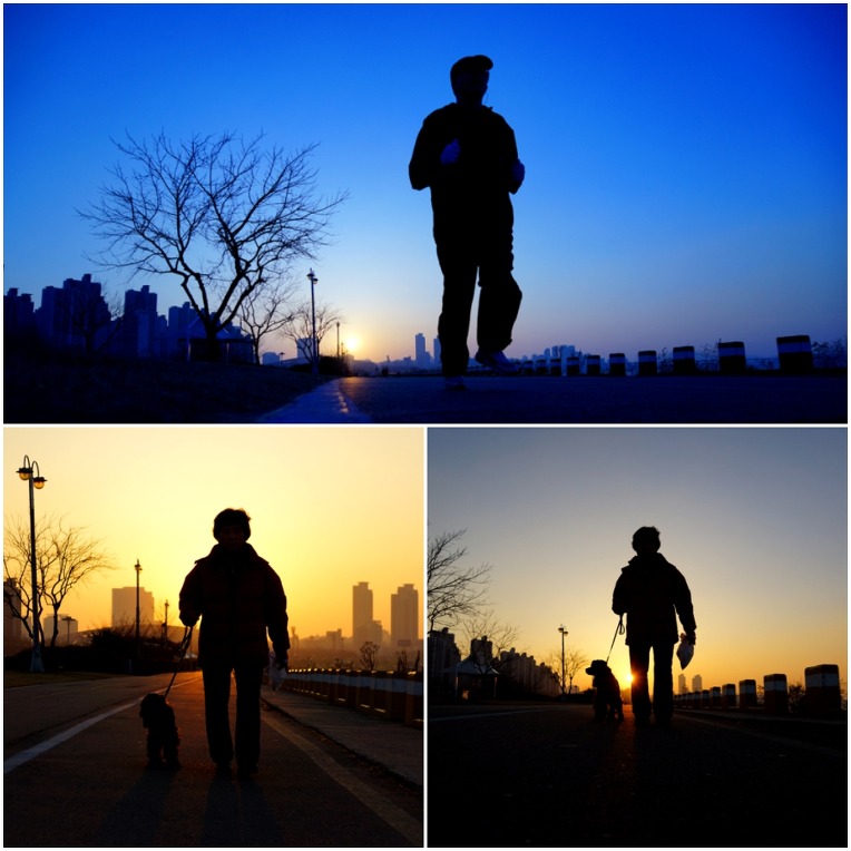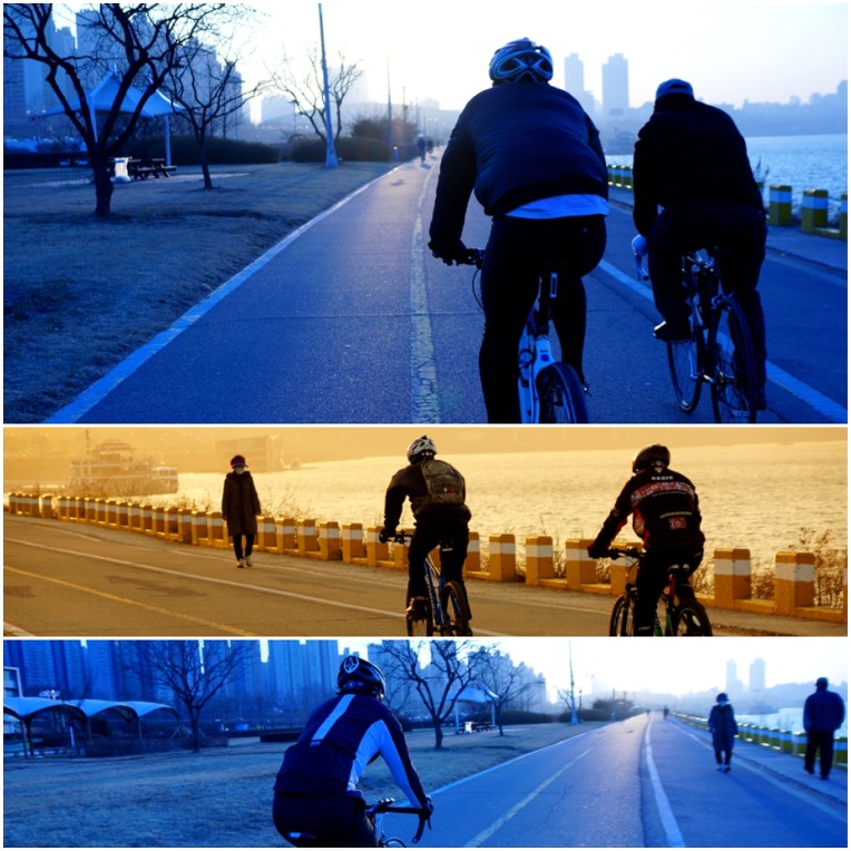 3월 5일은 경칩으로 대동강 물이 풀린다 하여 완연한 봄기운으로 따뜻해진 날씨다. 요즘은 서울 성곽답사와 길상사 탐방 등으로 자전거를 자주 타지 못하고 있다. 앞으로도 서울시 곳곳을 자전거로 또는 걸어서 제대로 소개하려고 한다. 해질 무렵, 잠깐 까망블루와 함께 석양이라도 담고자 잠실 선착장으로 향했다. 아직 깍두기 타이어를 장착한 상태라 육중한 소리가 마찰음을 일으키며 짧은 해넘이를 담고자 서둘러 달리니 허벅지가 뻐근할 정도다. 저녁이 되자 안개가 점점 짙어지고 하늘은 구름도 없이 희미하게 빛바랜 붉은 햇덩이를 삼성동 빌딩들이 삼키는 중이었다. 여름철에는 남산 쪽으로 향하던 노을이 3월초엔 방향이 사뭇 달랐다. (사진비교 위:7월 석양. 아래:3월 석양) 자전거는 이동수단으로 사진을 즐겨서인지 자전거 탄 사람들은 언제나 앵글 속 주인공들이다. 석양이 물든 방향을 보니 자전거 도로와 일직선으로 있어 사진 담기가 그리 쉽지 않았다. 자전거도로 중앙선에 서서 앞뒤를 조심스럽게 살피며 오가는 자전거 탄 풍경을 담기 시작했다. 아무래도 질주하는 자전거 길 한 가운데 서서 사진 찍기는 상당히 위험해서 어쩌다 통행이 뜸할 때만 골라 담았다. 결국 둔치 잔디밭 쪽에서 사진을 담을 수밖에 없었다. 역광과 실루엣 특히 역광을 좋아하는 이유 중에 하나가 사람들의 얼굴을 정면으로 보이지 않아 초상권에서 자유롭고 또한 실루엣은 특별한 상상의 힘을 불어 넣어 주기 때문이기도 하다. 산책하는 사람을 사진 찍으면 깜짝 놀라 손 사례로 거부 반응을 보이곤 하지만, 우선 몰카로 찍고 보여드리면 대부분 허락한다. 아마도 역광의 실루엣이라 오히려 멋지다고 사진을 보내달라고 할 정도다. 또한 포즈를 부탁하면 선뜻 허락도 해준다. 카메라 화이트밸런스 설정을 푸른 노을과 붉은 노을 색으로 바꿔가며 풍경을 담는다. 한강은 언제 얼었었냐는 듯 유유히 흐르고 강변을 거니는 사람들의 여유로운 모습과 속도를 내며 핸들의 방향으로 페달을 밟은 사람들의 속도를 맞추기 위해 연사로 촬영했다.(사진의 주인공이 되신 여러분들 감사드립니다.) 길 위에서 조우한 용수산님 한참 사진을 담고 있는데 카메라 앵글을 스쳐가던 한 분이 다시 되돌아오면서 혹시 호미숙씨 아니냐며 말을 건넨다. 3년 전 잠실비치발리볼 대회장에서 우연히 한 번 뵈었던 분이다. 평소에 여행기를 자주 보기에 까망블루와 사진 찍는 모습으로 금세 알아보셨다고 한다. 반가운 마음에 인사드리고 일부러 자전거 탄 모델을 부탁해서 몇 장을 담았다. 의도되지 않는 행운의 페닝샷 속도가 있는 자전거를 중심으로 배경이 흐리게 나와 역동적으로 나타나는 사진으로 평상시 일부러 담으려 해도 쉽지 않은데 우연히 자전거 탄 장면을 찍다보면 자연스럽게 행운처럼 패닝샷도 담을 수 있다. 돌아오는 길 해넘이가 마치고 핸들을 돌려 되돌아오는 길 어둠이 깔리고 서서히 이곳 저곳 불빛들이 선명해지기 시작했다. 광나루 둔치 자전거공원을 휘 돌아 광진교와 둔치를 밝히는 불빛을 담고 천호공원으로 향했다. 자전거랑 사진여행 천호동 자전거도로를 지나 잠실대교 아래 쉼터에서 휴식하는 여성 라이더와 붉은 석양에 맞서 거니는 젊은 여인 석양과 마주한 라이더 그리고 한강을 스쳐가는 자전거 탄 풍경 길 위에서 서서(자전거도로 한가운데) 석양에 실루엣으로 하트를 만들어 주신 언니들 달리는 분도 강아지와 산책하던 분도 포즈를 부탁 3년 만에 길 에서 만난 용수산님. 반가웠습니다. 늘 건강하세요. 잠실 대교 아래서 패닝샷의 행운도 잠실대교 아래 자전거, 잠실철교 아래 성내교, 올림픽대교 아래 노을 광나루 둔치에서 광진교와 자전거공원 신호등에서 빠른 속도로 스쳐가는 버스와 천호공원 공중전화 박스
