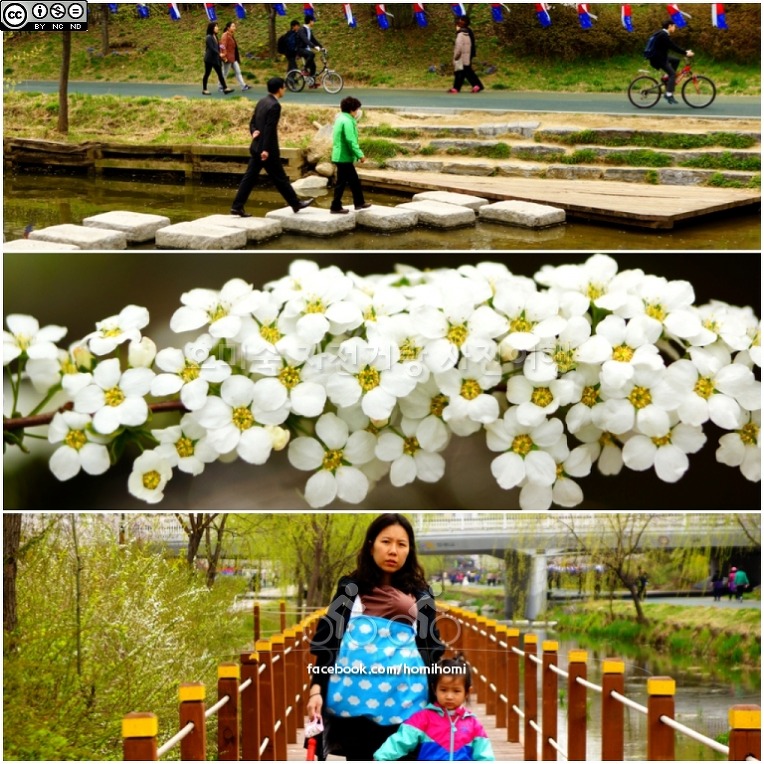 조팝나무 꽃 향기로움이 코끝을 스칠 때 아기를 안고 거닐며 한가로움을 즐기는 모녀 옛추억이 절로나는 징검다리 추억
