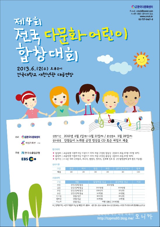 올해 2013년 제 4회 전국 다문화 어린이 합창대회는 6월12일 수요일 오후 2시에 건국 대학교 새천년관 대공연장에서 개최가 되네요~~ 이번 제 4회 전국 다문화 어린이 합창대회는 사단법인 한국다문화센터와 여성가족부가 공동 주최를 하고 한국 수출입 은행과 EBS가 후원합니다.
