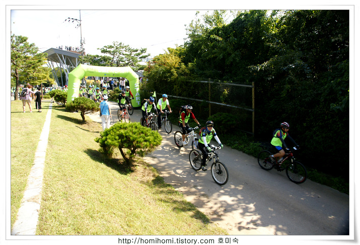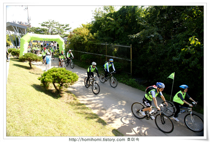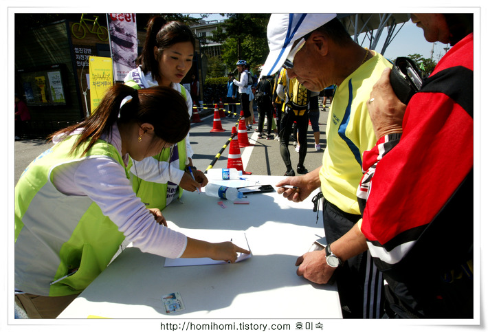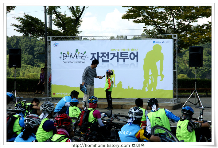 가족과 친구와 연인들과 또는 동호인들이 함께 모여 접수처에서 신분증 맡기고 조끼와 RFID카드를 받아 민통선을 들어갈 수 있도록 접수를 마치고 드디어 오후 1시, 200여명이 참석한 개회식을 시작으로 준비운동 후 철조망으로 가려진 민통선 입구 출입문을 열고 자전거 탄 사람들은 철조망과 철조망 사이 농로 길 따라 누렇게 익어가는 가을 들녘 길을 달렸다