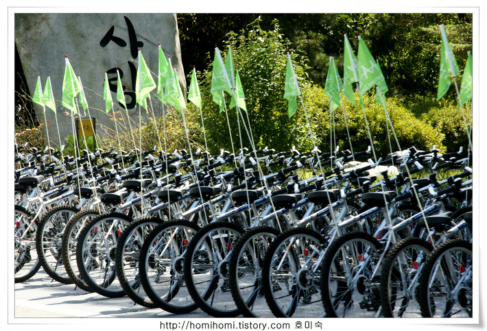 임진각에 가면 자전거를 빌려 자전거 투어 할 수 있습니다. 오늘 해아를 알리는 깃발이 꽂혀 있습니다