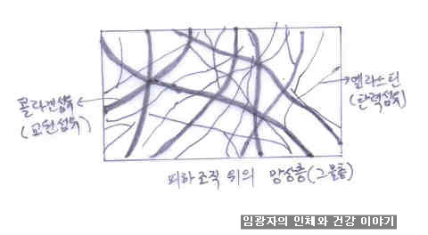 우리 몸에서 물 다음으로 단백질이 많다. 우리 몸을 이루는 단백질 중에서 1/3일이 콜라겐이다. 콜라겐은 연골, 뼈, 인대, 힘줄, 근육, 피하지방 아래 망상층에 많다. 콜라겐은 섬유성 단백질이다. 콜라겐은 인대, 힘줄을 질기게 해주고, 뼈를 튼튼하게 해주고 근육을 탄력 있게 해주고, 피하지방 아래 엘라스틴과 함께 망상층을 형성하여 피부를 팽팽하게 만들어준다. 피부에 콜라겐이 풍부하면 탄력 있고 팽팽한 피부를 유지하여 주름이 없지만 나이 들어 갈수록 콜라겐은 점점 줄어들어 노화가 시작되고 탄력을 잃고 주름이 생기고 급기야는 쭈글쭈글 해진다. 우리 몸은 세포로 되어있다. 우리 몸은 난자와 정자가 수정하여 만들어지는 하나의 세포인 수정란에서 출발한다. 하나의 수정란이 세포분열을 계속하여 세포수를 늘려서 발생하고 태어나고 자란다. 크다는 것은 세포 수가 많다는 거고, 적다는 것은 세포 수가 적다는 거다. 어른의 경우 우리 몸을 이루는 세포 수는 50조~60조다. 그 많은 숫자의 세포들이 모여서 우리 몸을 이룬다는 것은 그만큼 세포의 크기가 작기 때문이다. 우리 몸을 이루는 세포는 여러 종류다. 뼈세포, 근세포, 연골세포, 신경세포 등은 모양이 다 다르다. 동물 세포의 맨 겉은 부드러운 세포막으로 되어 있다. 세포와 세포 사이에는 콜라겐 같은 세포간 물질이 채워져서 세포가 일정한 모양을 이루고 살아 갈 수 있게 한다. 바로 눈에 보이는 피부를 보면 매끄럽고 탄력 있고 팽팽하다. 무엇이 피부를 아름답게 해 줄까? 피부아래에는 피하지방층이 있고 바로 그 아래 콜라겐과 엘라스틴이 그물 층을 만들어 위에 있는 피하지방층을 받쳐 주기 때문에 피부를 아름답게 만들 수가 있다.