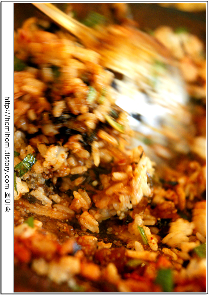 그 위에 날치알과 김치와 김가루를 뿌려 볶아 줍니다