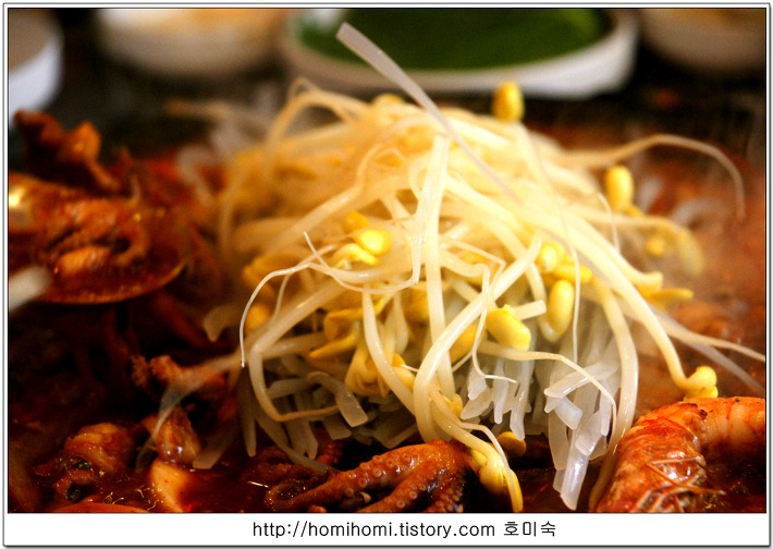 그때, 주인아주머니 아삭아삭 잘 삶긴 콩나물을 큰 젓가락으로 더 얹어 주시네요