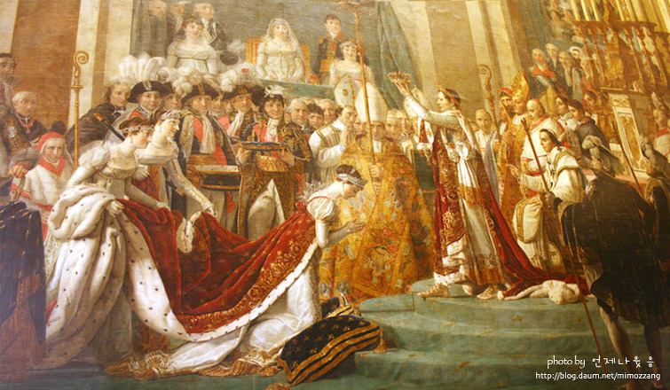그림에 숨은 이야기 #1 루브르 박물관에 그린 원본에선 다른 여인들과 같은 흰옷을 입었으나, 베르사이유 궁전 그림에선 핑크색으로 채색해 다비드가 폴린을 좋아한다는 소문이 세간이 퍼졌었다고 전해지고 있습니다. 조세핀이 나폴레옹보다 6살이나 연상인데다 이혼녀이고, 행실까지 문란하여, 나폴레옹이 원정을 나간 사이 바람을 피우기까지 해서 여러모로 맘에 차지 않아 참석을 하지 않았으나 나폴레옹의 요구로 다비드가 그림에 넣었다고 합니다. 조세핀의 이런 행각을 나폴레옹도 모르는 바는 아니었으나, 당시엔 너무 사랑하여 덮어두고 살았으나, 훗날 조세핀이 자신의 아이를 낳지 못하자 결국 내쳤다고 전해지고 있습니다.